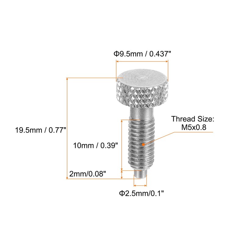- Size - M5x0.8 thread size, Thread Length: 10mm / 0.39 inches; Pin Diameter: 2.5mm / 0.1 inches(0.025 to -0.05mm tolerance); Pin Length: 2mm / 0.08 inches; Knurled Handle: 9.5mm x 4mm / 0.437 inches x 0.16 inches; Total Length: 19.5mm / 0.77 inches; Small and lightweight for easy carry with you.