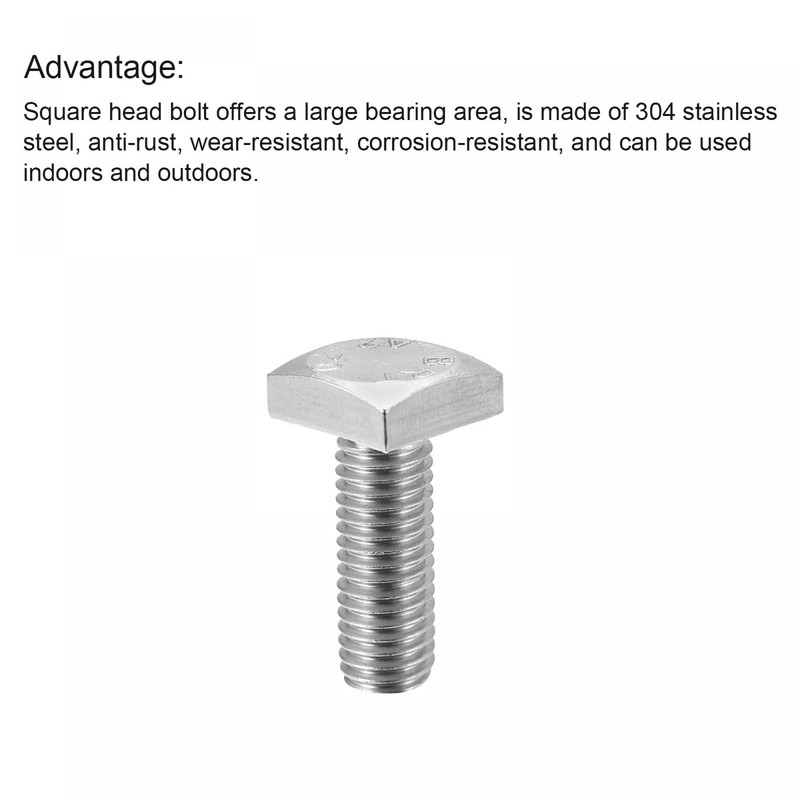 - Advantage: Square head bolt offers a large bearing area, is made of 304 stainless steel, anti-rust, wear-resistant, corrosion-resistant, and can be used indoors and outdoors.