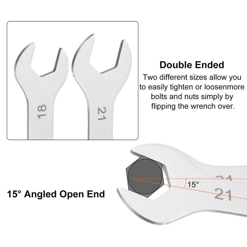 • 【Standard】18mm x 21mm metric sizes, 8.86-inch (225mm) total length, Thickness (Approx): 3mm / 0.12-inch; Two sizes per wrench make it more versatile