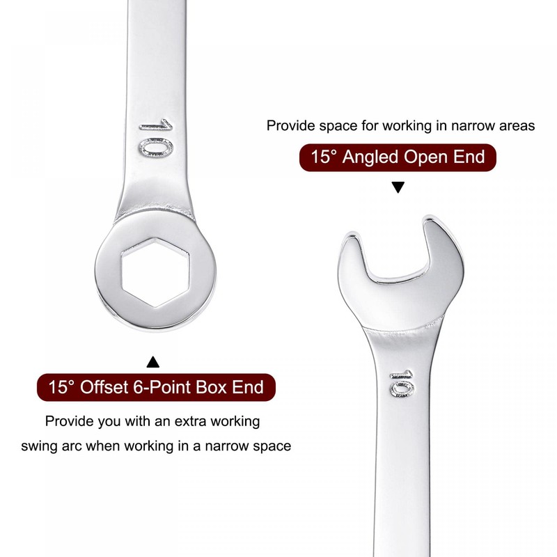 - Open end: It is angled at 15 degrees, so the key can be turned over to lock the fasteners in tight spaces twice as often.
