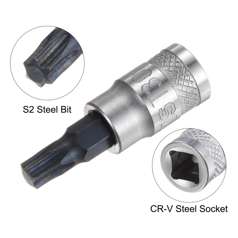 - Material - The torx socket bit is made of heat treated quenching of S2 alloy steel, with a hardness of HRC58-60, and a high-strength chromium vanadium steel (CR-V) socket with strong torque.
