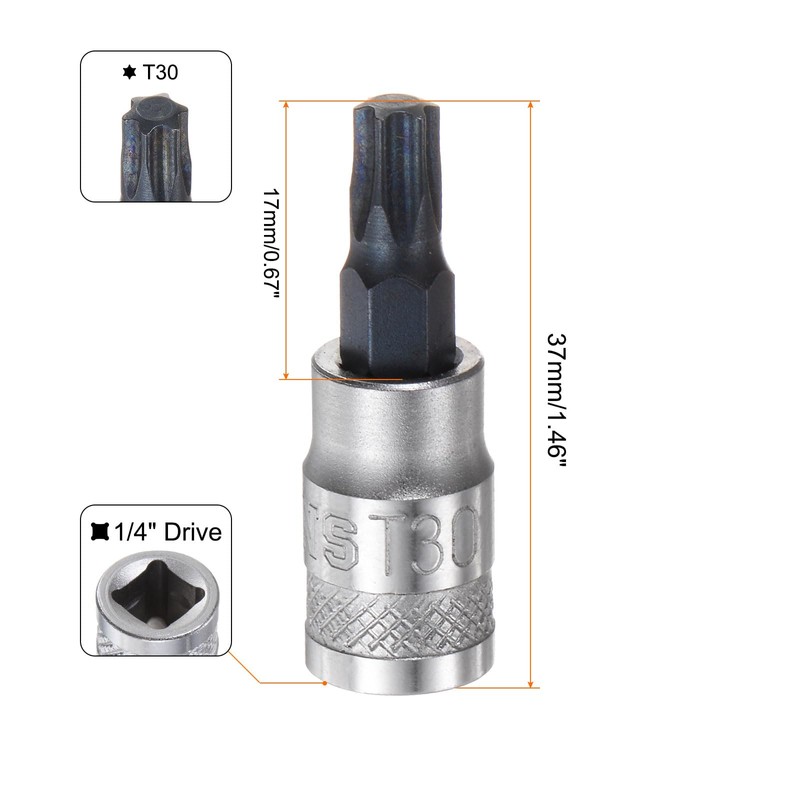 - Size - T30 torx bit, 1/4-inch drive star socket, with a total length of 37mm/1.46" and a bit length of 17mm/0.67".