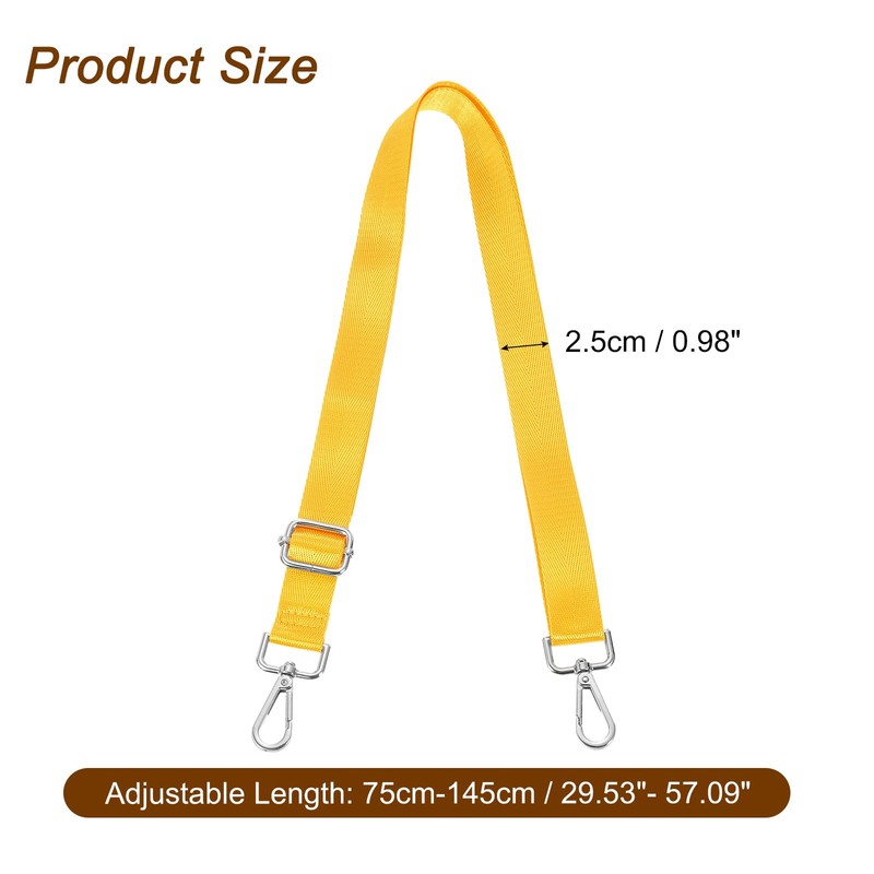 - Color: Yellow; Material: Faux Nylon; Adjustable Length: 75cm-145cm / 29.53"- 57.09"; Width: 2.5cm / 0.98"; Package Content: 1Pcs x Wide Shoulder Strap(2Pcs x Hook Buckles, 1Pcs x Silver Pull-core Buckle)