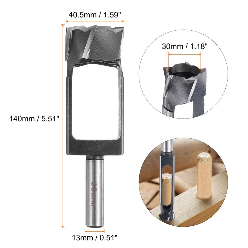 • Size - Tenon Cutter: 140 x 40.5 x 30mm / 5.51 x 1.59 x 1.18 inch (L*OD*ID); Shank Dia: 13mm / 0.51"; Package Included: 1pcs Tenon Cutter. The multifunctional tool can automatically inject tenons, and make tenons on round or square stock.