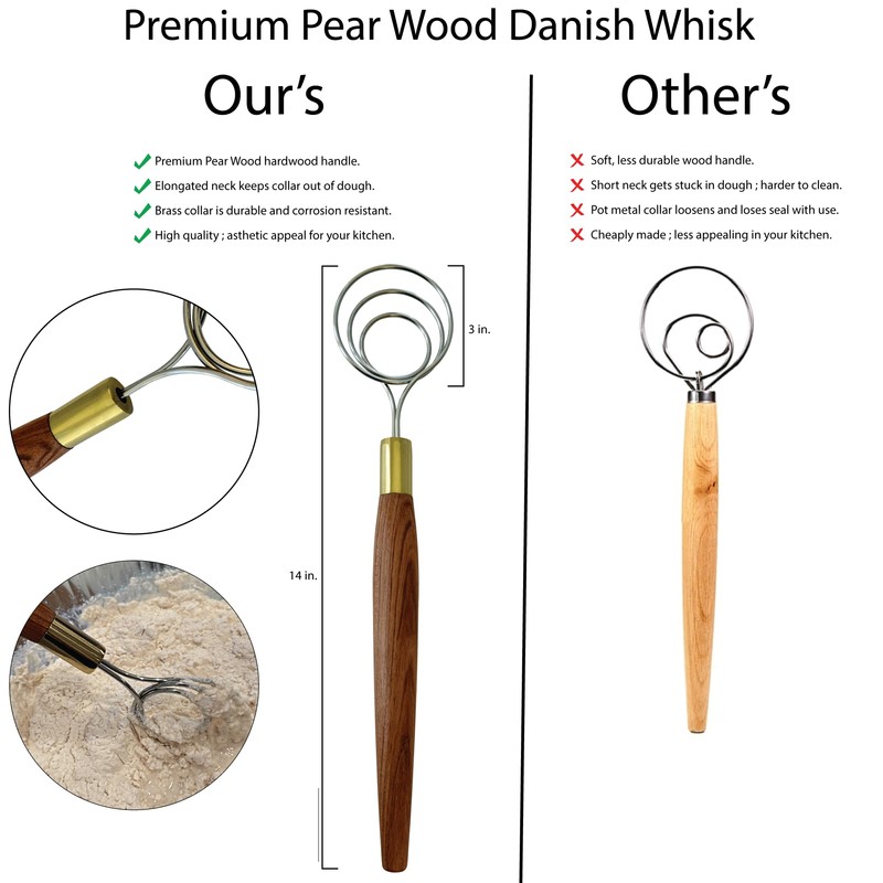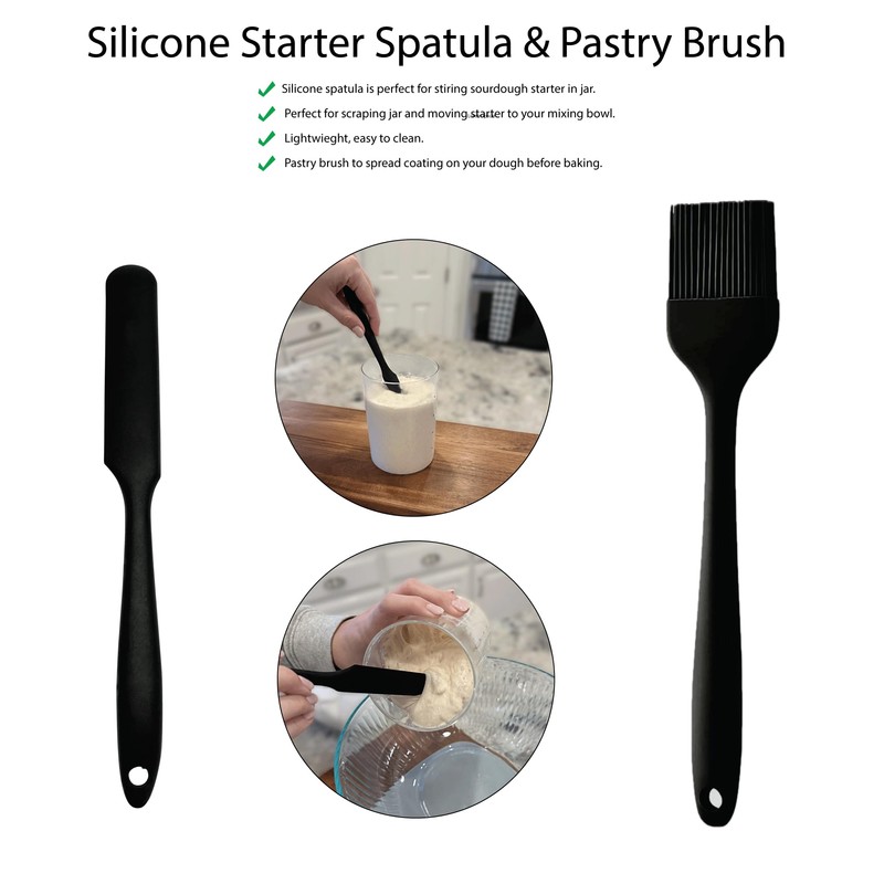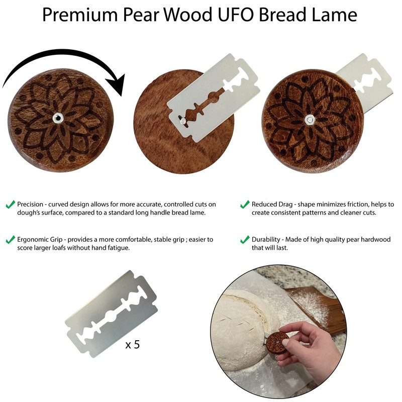 - What's Included: Premium Long-Neck Pearwood Dough Whisk for smooth, effortless mixing. Round Pearwood UFO Bread Lame for perfect, precise scoring. Silicone-Handled Dough Scraperfor seamlessdough handling. Plastic Bowl Scraper for easy dough transfer. Silicone Spatula for hassle-free sourdough starter management. Stainless Flour Duster to dust your loaves evenly for the perfect finishing touch. Silicone Brush to baste your loaves with precision for that perfect golden crust.