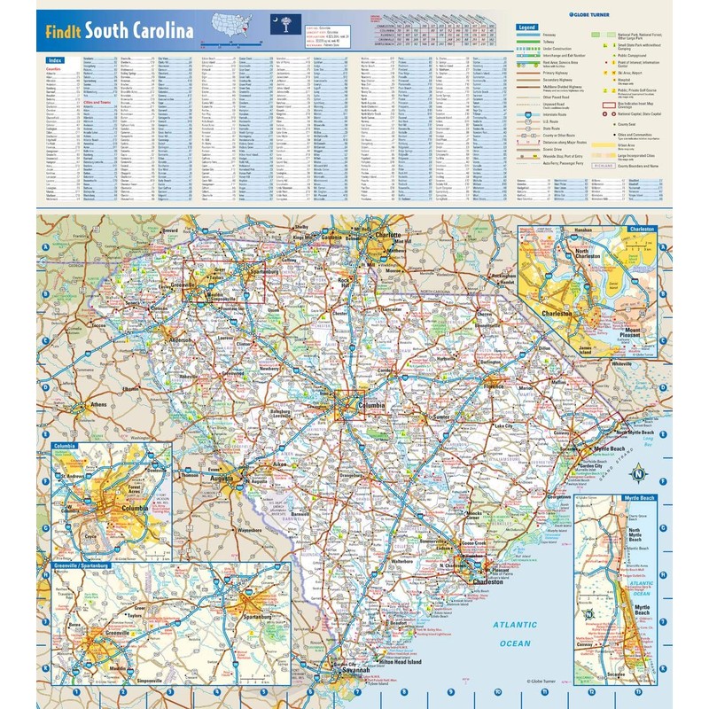 This colorful, easy-to-read state map of South Carolina identifies all major thoroughfares, secondary roads, freeway interchanges, rest areas, distance markers, landmarks, recreational areas, and more. Shaded relief on the state map provides a three-dimensional sense of South Carolina's topography. Detailed city inset maps of Charleston, Columbia, Greenville-Spartanburg, and Myrtle Beach are based on the latest street information from our cartographic experts. County and city indices make it simple to locate even the smallest town.