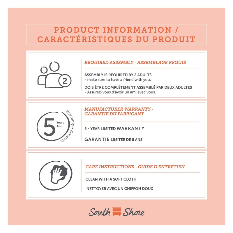 - 5-YEAR LIMITED WARRANTY: South Shore is proud to stand behind this 5-drawer chest dresser with an exclusive 5-year limited warranty. Shop with confidence knowing your purchase is always covered.