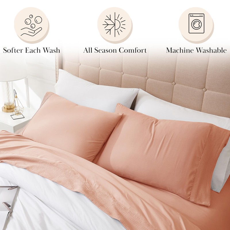 - FADE-PROOF & LOW-MAINTENANCE SPLIT KING SHEETS: This blush sheet set is machine washable and tumble dry-safe. Our luxury sheets keep their color and softness over time, outlasting other deep pocket bed sheets and king bedding sheets.