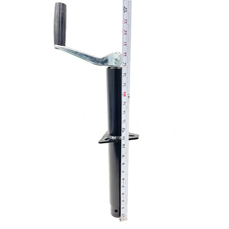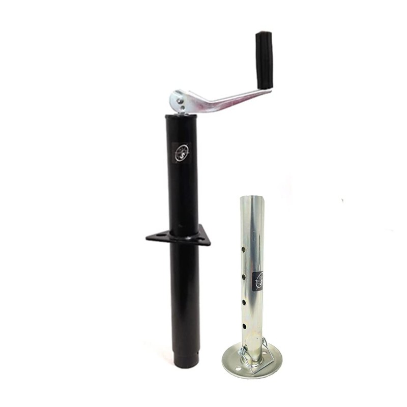 5,000 lbs top wind A-frame Jack W/Zinc Adjustable Drop Leg. 3,000 lbs. Lift Capacity. 5,000 lbs. Support Capacity. 14" Travel. Bracket to bottom Retracted = 10.5". Bracket to bottom extended = 20". Bracket to top = 9". Outer Tube Diameter = 2-1/4". Inner Tube Diameter = 2". Zinc Adjustable Drop Leg: 8" of total adjustability (2" from hole to hole). 13" (H) x 5-1/4" (L). Will Hold 2,000 lbs. Durable exterior grade black powder coat finish. Large black handle uses a bolt head fastener. this is to ensure the handle does not pop off during operation of the jack. Handle arm has durable zinc finish for a nice look. Standard A-frame jack mounting hole dimensions are 3 inches apart center to center.