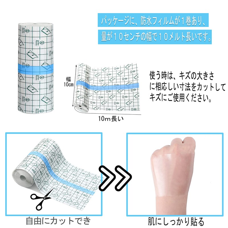 SouZouキズ防水フィルム キズパワーパッド 大きめサイズ キズに保護テープ 防水ドレッシング キズに保護フィルム 防水 透明 粘着性 創傷用粘着 入浴 水泳 タトゥー介護 産後キズ保護 カットでき 10x1000cm 1巻