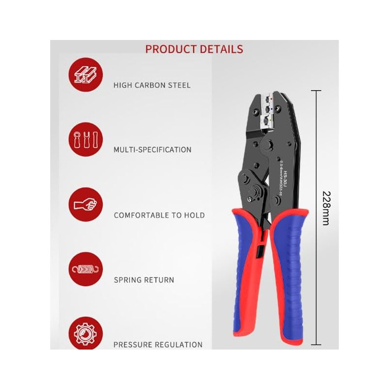 • Precise Mechanics - The crimping process is accomplished by pressing the handle through a complete ratcheting cycle until the handle is automatically released. Due to the ratchet, you are able to secure the connector first and then insert the wire into the crimp.