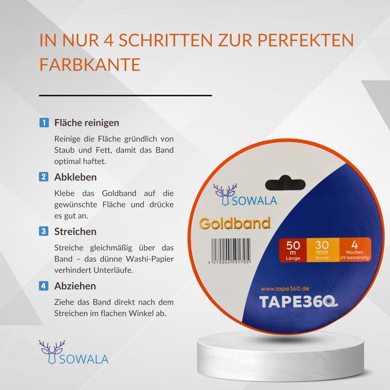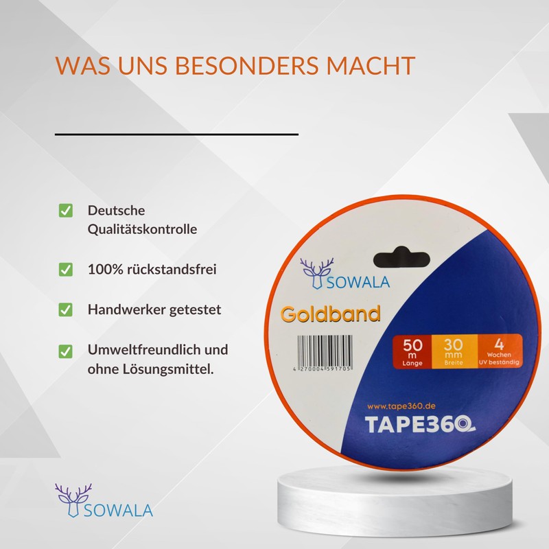 sowala Gold tape 30 mm x 50 m - the professional painter's masking tape for perfect colour edges. Our high-quality gold tape masking tape made of extra thin washi paper ensures razor-sharp colour lines - without underruns and colour gradients. The masking tape is UV resistant for up to 30 days, heat resistant up to 100°C and is ideal for indoor and outdoor use. Thanks to the special adhesive technology, the masking tape can be removed cleanly and residue-free after use, even on sensitive surfaces such as glass, wood or walls. Whether for painting, renovations, precise edges on walls, doors and skirting boards or creative DIY projects - with the sowala Goldband you can achieve professional results. Trust in quality from the professional and rely on the original sowala gold band for your next project - for clean work and a perfect finish.