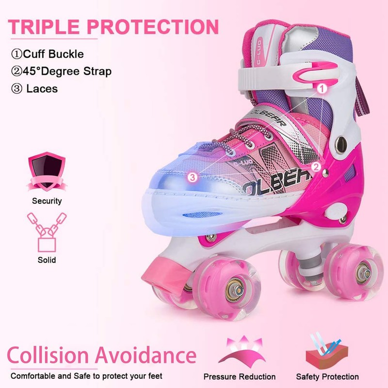- 8 WHEELS ILLUMINATING-All wheels with illuminating colorful lights when skating with roller skates, they are fairly cool and NO BATTERIES NEEDED! With the coolest light up wheels, make your little girl a real shining star.