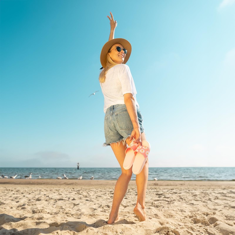 - Goes well both at the swimming pool, on the beach with a swimsuit as well as shorts or a skirt in the city, as well as at home, as women's or men's slippers.