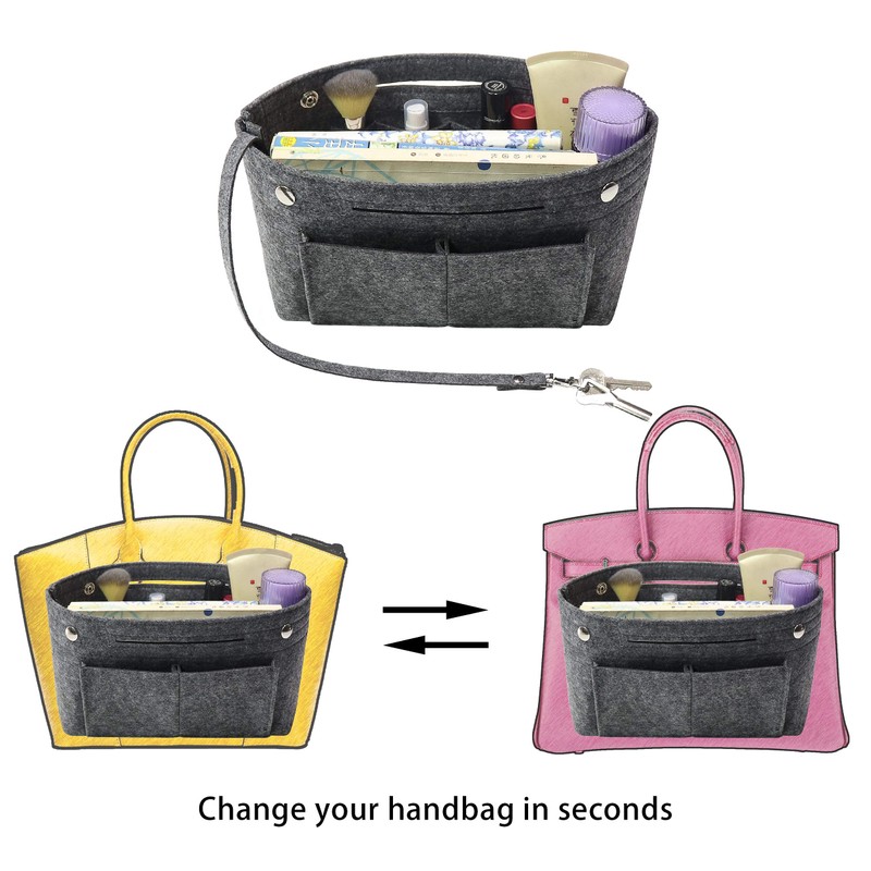 - BUILT-IN HANDLES & REMOVABLE LONG KEY CHAIN The handbag organizer insert with built-in handles makes it easier and more convenient to change your handbag in seconds. Extra removable long felt key chain makes it easy to find the keys and is long enough to reach the door.