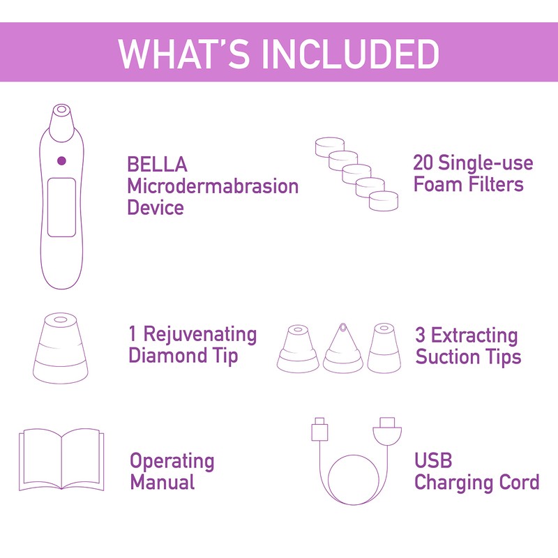 - MICRODERMABRASION - BELLA’s patented design uses precision-cut diond bits to precisely buff away dead skin cells, revealing fresh, radiant skin.