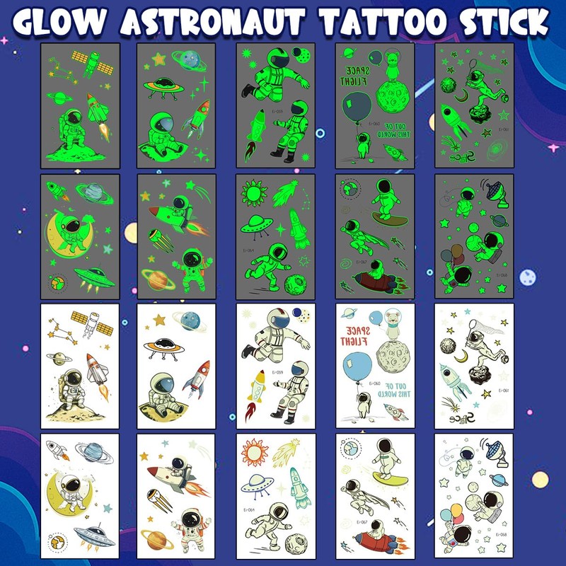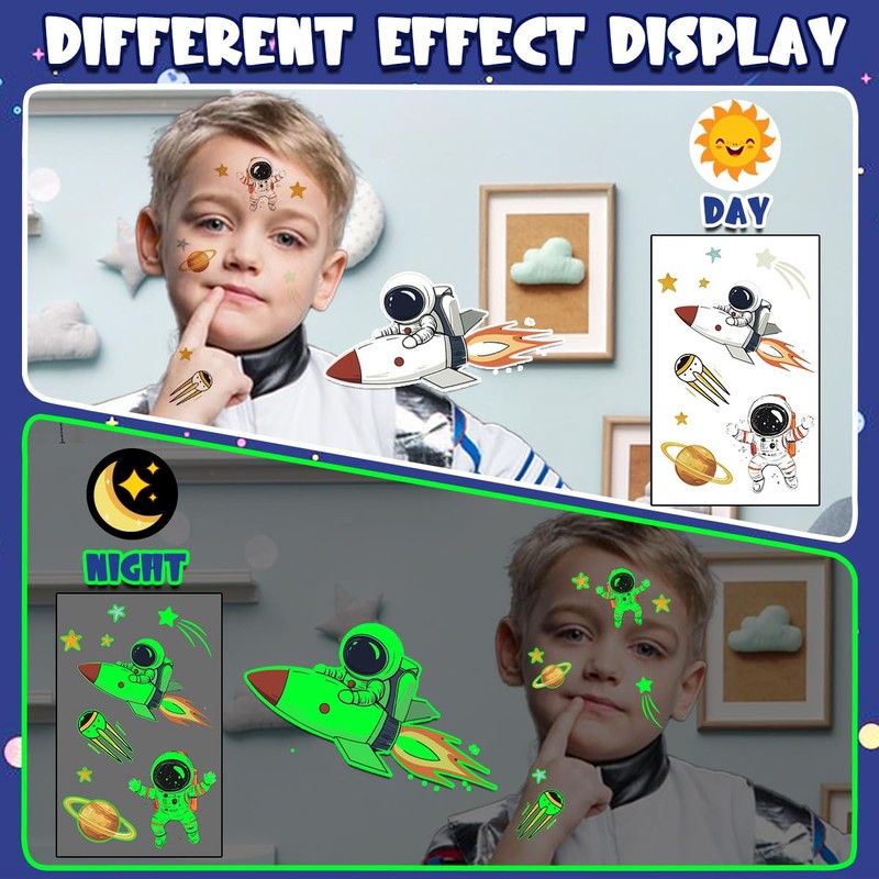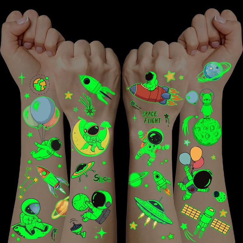 - Space tattoo children: these 10 sheets of temporary tattoos with space motifs such as rockets, planets, astronauts and stars charge in the light and then glow in the dark. An absolute eye-catcher for children at night or in a dim room