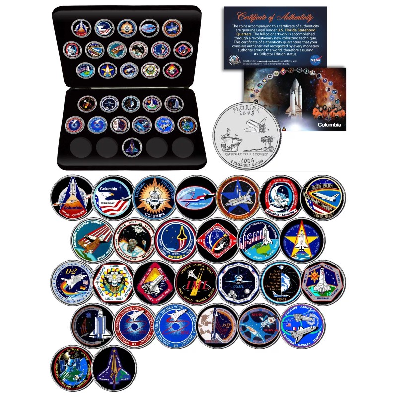 Space Shuttle Columbia was the first space-rated Space Shuttle in the orbiter fleet. Here is your chance to own a complete set of twenty-eight (28) colorized 2004 Florida Statehood Quarters U.S. Coins of the SPACE SHUTTLE COLUMBIA MISSIONS. These high-quality, genuine Legal Tender United States coins have been colorized using a unique painstaking multicolor authentic process by the Merrick Mint. Colorizing coins involves the unique application