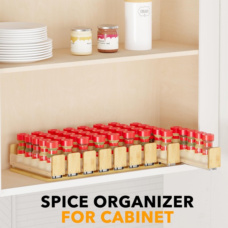 - DURABLE MATERIAL TO LAST - Crafted from premium quality bamboo, this slide out seasoning organizer is built for long-lasting use; Our space-saving spice rack complement your home storage system and maximize cabinet space efficiency
