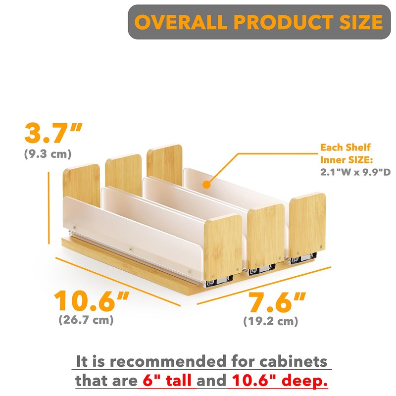 - MEASURE CABINET SIZE - Please measure the interior dimensions of your kitchen cabinet first; It is recommended for cabinets that are 12" tall and 10.60" deep; This is the version of 3 Drawers(2" Wide), 1-Tier; Overall Product Size: 7.6"W x 10.6"D x 3.7"H