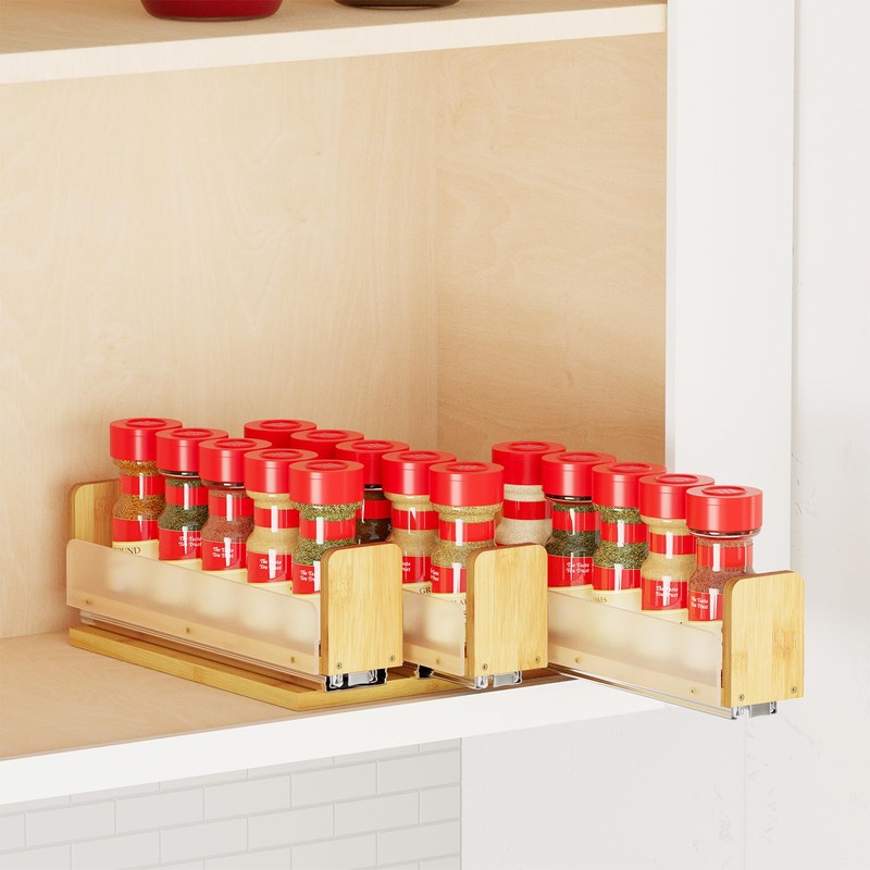 - HEAVY-DUTY SPICE RACK FOR CABINET - Smooth ball bearing glides allow easy sliding; Full extension rails give complete access to all your spices in kitchen upper cabinets; Bottom panel clears any cabinet lip for a perfect fit