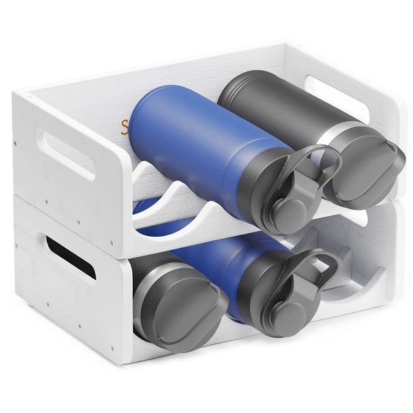 - IDEAL BOTTLES STORAGE - Keep your home clean and keep track of your water bottles better with this bamboo organizer holder; Instead of awkwardly squeezing those water bottles into empty cabinet spaces