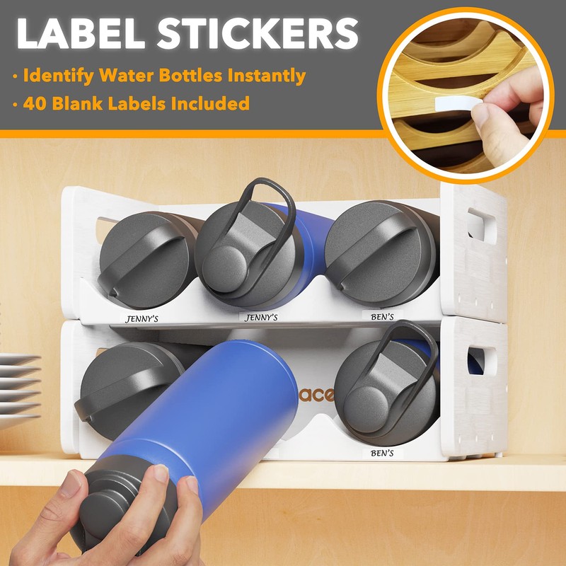 - BLANK LABELS INCLUDED - Identify bottles instantly with the labels on the shelf front; You can write and label the bamboo holder clearly, or not use the labels to keep the clean look of the water bottle organizer