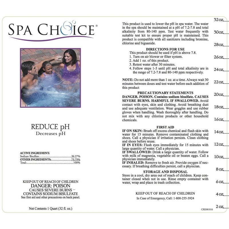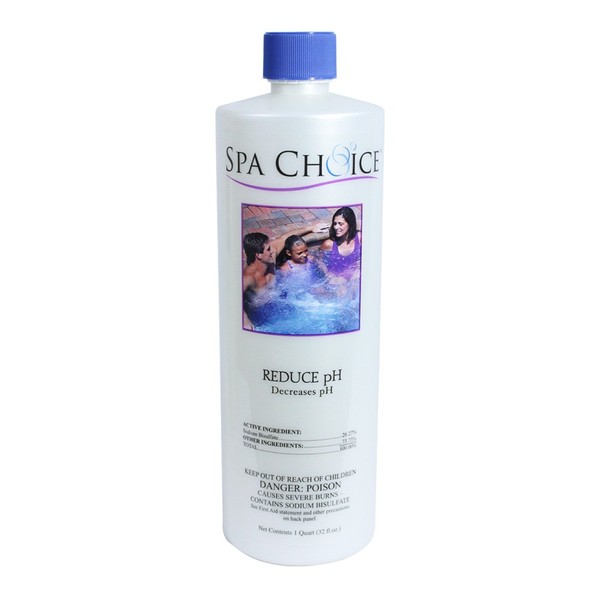 Spa Choice Reduce pH lowers the pH level of your spa water. Spa water should be maintained at a pH of 7.2 - 7.8. Test water frequently with a test kit or test strip to ensure pH levels remain in the recommended range. Spa Choice Reduce pH is compatible with all sanitizers including bromine, chlorine and biguanide. This product is used to lower the pH in spa water. The water in the spa should be maintained at a pH of 7.2-7.8 and total alkalinity from 80-140 ppm. Test water frequently with suitable test kit to ensure proper pH is maintained. This product is compatible with all sanitizers including bromine, chlorine and biguanide. This product should be used if pH is above 7.8. DIRECTIONS FOR USE: 1. Turn on air blower or filter system. 2. Add 1 oz. of this product. 3. Retest water after 30 minutes. 4. Follow steps 1-3 until pH and total alkalinity are in the range of 7.2-7.8 and 80-140 ppm respectively. NOTE: Do not add more than 1 oz. at a time. Always wait 30 minutes between doses and test water before each addition of this product