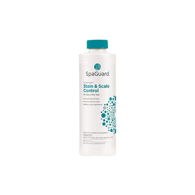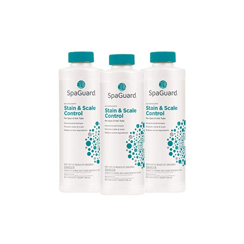 SpaGuard Stain & Scale Control (1 qt) (3 Pack) SpaGuard Stain & Scale is a liquid sequestering agent. Scale or calcium carbonate build-up can cause damage to your spa surface as well as your circulation system. SpaGuard Stain & Scale Control does a great job of preventing scale by introducing powerful agents that bond to problem-causing calcium ions in your spa water. Product Information: pH 3.0 Prevents scale formation and cloudy water due to high calcium levels Removes some scale buildup on spa surface Removes relatively fresh metal stains from spa surfaces Directions for use: 1. Clean filter 2. Apply 1 ounce per 300 gallons directly to the spa or hot tub 3. Let pump run at least 2 hours after treatment 4. Add 1 ounce per 300 gallons weekly for maintenance