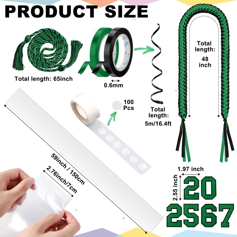 - Suitable Size: the size of each element of the kit has been carefully considered for your comfort; The graduation necklace is about 48 inches in length, 2 inches in width; The honor cord reaches about 65 inches; The clear plastic bag stretches around 4.92 ft/ 1.5 m in length, 2.76 ft/ 7 m in width; Each roll of ribbon measures approx. 16.4 ft/ 5 m; Wooden handicrafts with numbers are compact at about 2.76 x 1.77 inches; All these ensure the adornment fits seamlessly into your academic regalia
