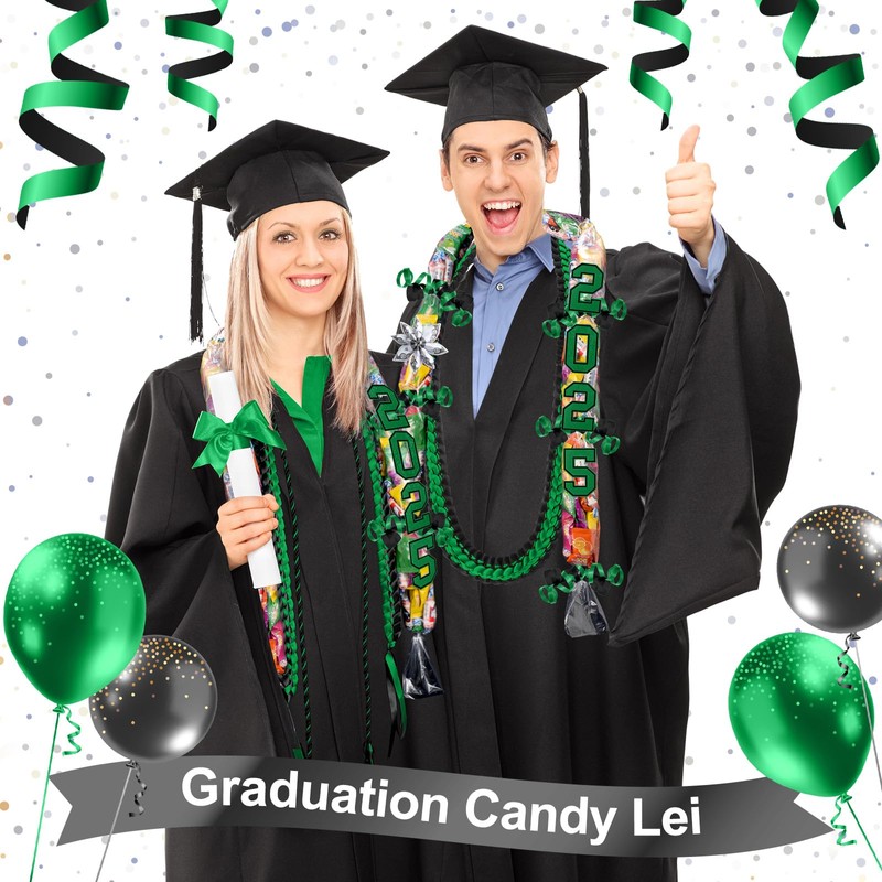 Spakon 13 Pcs Graduation Leis Graduation Candy Lei Kit Class of 2025 with 48 Inch Braided Ribbon 4.92ft PE Bag for Grad Party(Black, Green)