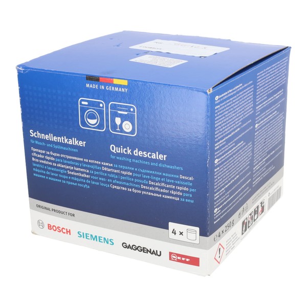 - Quick descaler for washing machines and dishwashers 4 packRemoves limescale quickly and effectively.Can improve the lifetime and performance of your washing machine and dishwasher.Ideal in hard water areas.Content 4 x 250g, sufficient for four applications. Use every three to six months for washing machines and once a year for dishwashers.