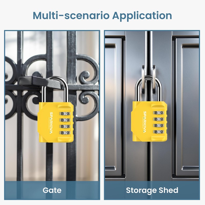 Designed for maximum durability, the Sparkiva padlock features a hardened steel shackle and a heavy-duty zinc alloy body, making it highly resistant to cutting, sawing, and brute force attacks. This robust construction provides exceptional protection for your garage, toolbox, storage units, and more. Its compact yet sturdy design is suitable for a wide range of applications, including gym lockers, fences, cabinets, sheds, and other valuables. Choose the Sparkiva 4-Digit Combination Padlock for a dependable, secure, and versatile locking solution that stands up to the demands of everyday use.