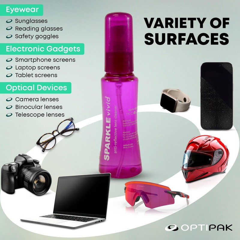 - Anti Reflective Coating Safe: OPTIPAK’s Sparkle Vivid eye glass cleaners spray kit is specially designed for anti-reflective coated lenses, providing smudge-free, streak-free clarity without damage. Safe for eyeglasses, sunglasses, and camera lenses.