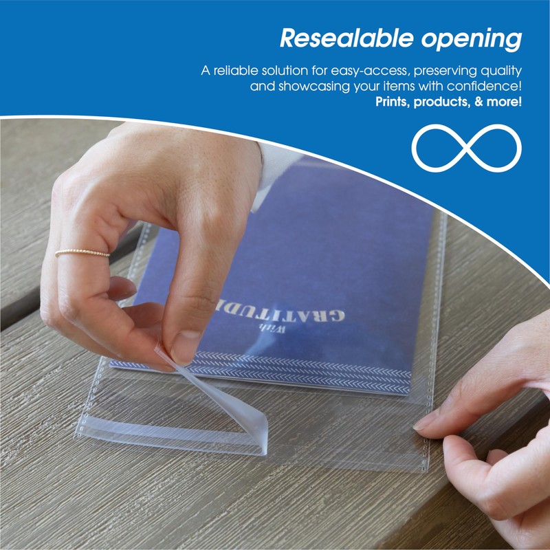 • SELF SEALING: By peeling and removing the adhesive strip, the clear bags become sealable in seconds. Our resealable adhesive allows you to easily reseal any opened clear sleeves.
