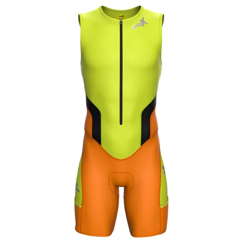 Sparx Men Competitor Triathlon Suit Mens Trisuits | Italian Technical Fabric | Soft Chamois | 4 Pockets | Bike-Swim-Run (Lime/Orange, 2XL)