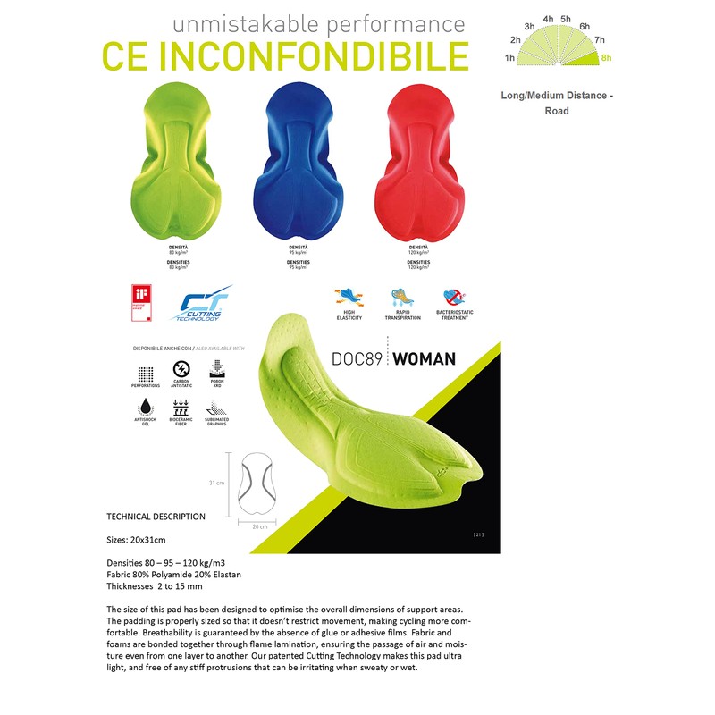• ✅ Pad FABRIC: 85% Polyamyde - 15% Spandex Medium to long distance ride women specific pad thanks to the Cutting Technology which allows only one high-density foam and different transition areas gradually changing thickness and support type: from the highest load on the seat area (ischial bones) to the medium load on the perineal area. It has no wings but an additional front cover area.