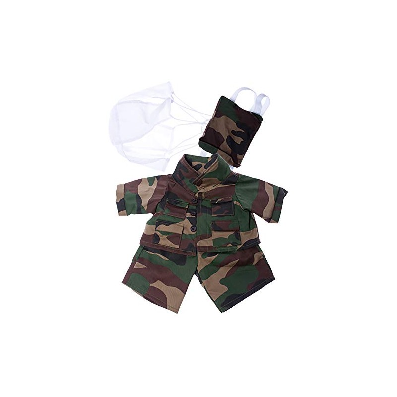 - AUTHENTIC: Authentic 5-piece special forces camos outfit. Camouflage shirt and matching cargo pants with elastic waist and ankle drawstrings. Stuffed Animal Outfit. 3-panel hat and faux supply bag with parachute.