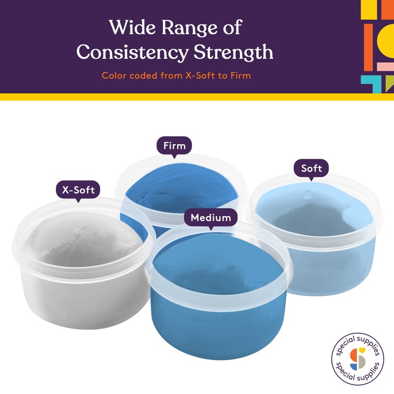 - Fun, Kid-Friendly Colors C Every set of our therapy putty for adults and kids comes with 4 individual containers of putty, each with its own brilliant color. This makes it easier for color-coded therapy or rotating their daily use.