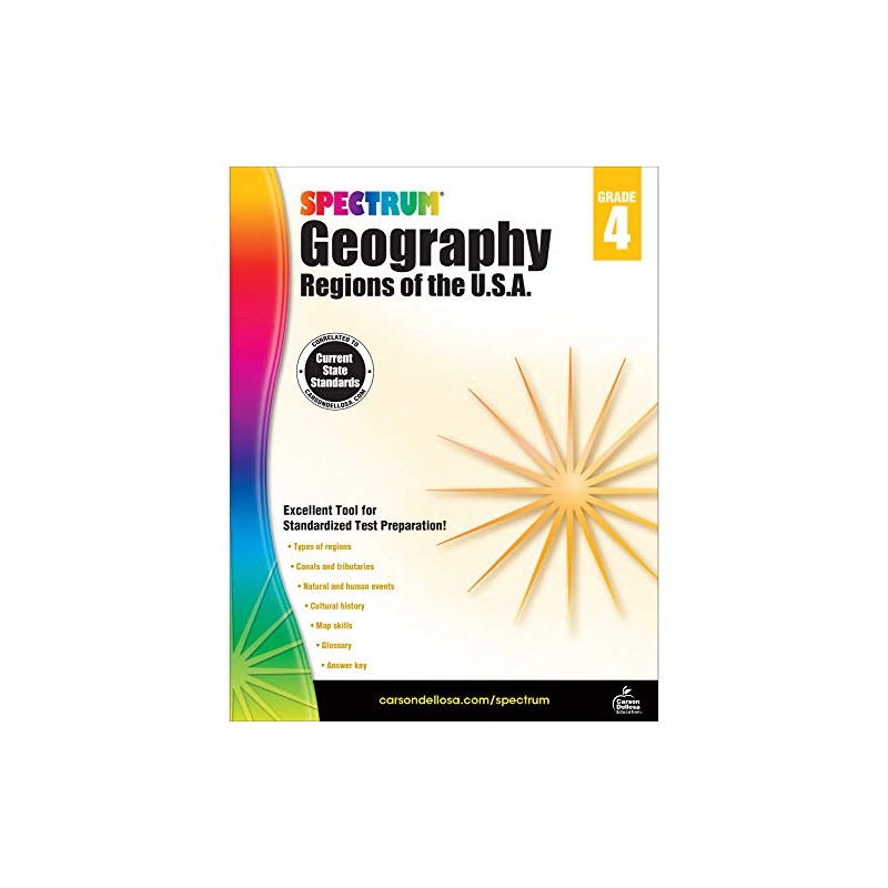 Winding through purple mountains majesties and amber waves of grain, the standards-based Spectrum Geography: Regions of the U.S.A. for grade 4 guides your childÕs understanding of maps, regions, canals, tributaries, and more using colorful illustrations and informational text. --Spectrum Geography is an engaging geography resource that goes beyond land formations and mapsÑit opens up childrenÕs perspectives through local, national, and global adventures without leaving their seats.