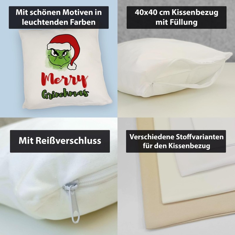 - The fun Merry Grinchmas cushion is a real eye-catcher. With its green Christmas muffle motif and the cheeky Merry Grinchmas lettering, it is guaranteed to make everyone smile. The cushion is available in four different surfaces - from cuddly to satin. Perfect for anyone who wants to see Christmas differently!