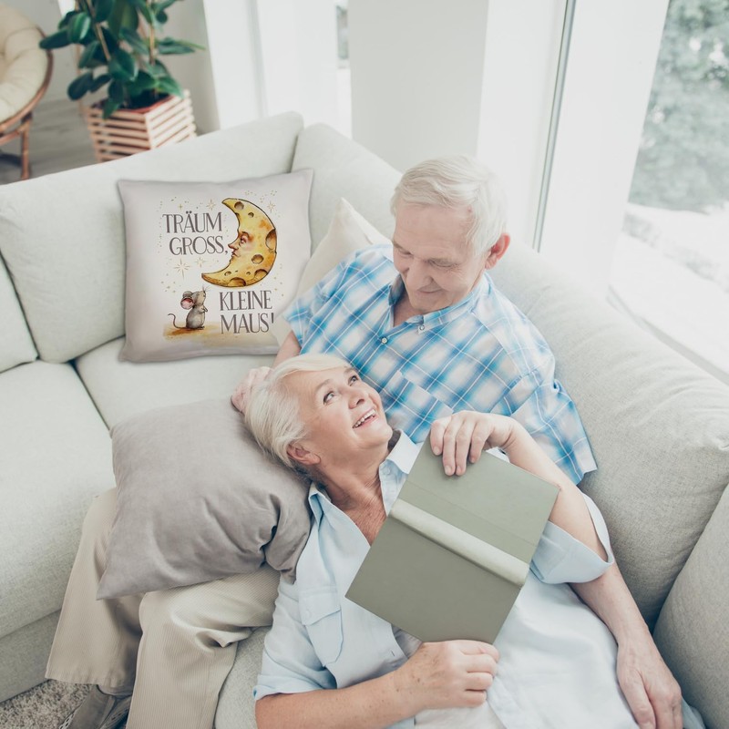 - The mouse and moon dream large cushion enchants with a charming motif: a little mouse admires a huge moon of cheese, surrounded by sparkling stars. In pastel watercolour style, the saying Träum gross, kleine Maus! on a white background.