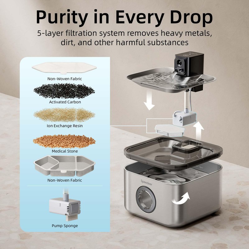 - 5-Stage Filtration System: A robust filtration system with five layers keeps water clean and healthy for your cat. Multiple filter components – including activated carbon, medical stone, Ion-exchange resin, and sponge – remove hair, debris, and impurities from the water. This thorough filtering eliminates odors and bad tastes, encouraging your cat to drink more and stay hydrated.