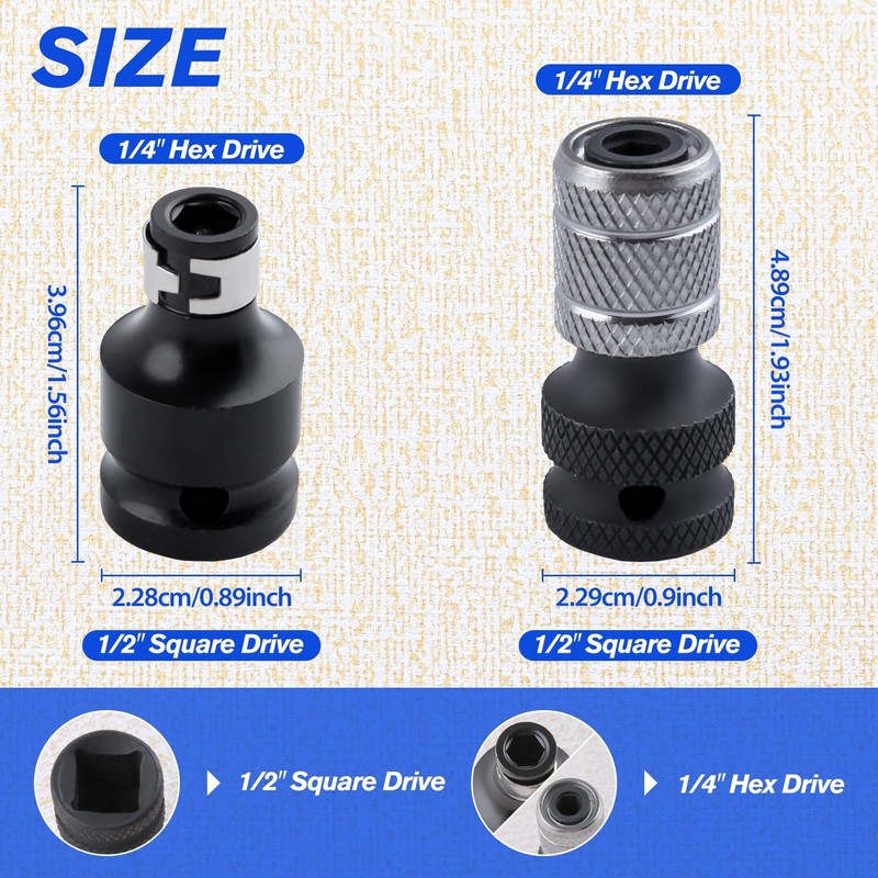 - 【Application】These two conversion clamps have 1/2" square electric spanner bayonet on one end and 1/4" hex hole on the other end for all kinds of bits, positioning bits, sockets, 4-way connecting rods, ratchets, torque spanners, impact spanners and other driving tools. Ideal for auto repair, carpentry work, other maintenance and manual work