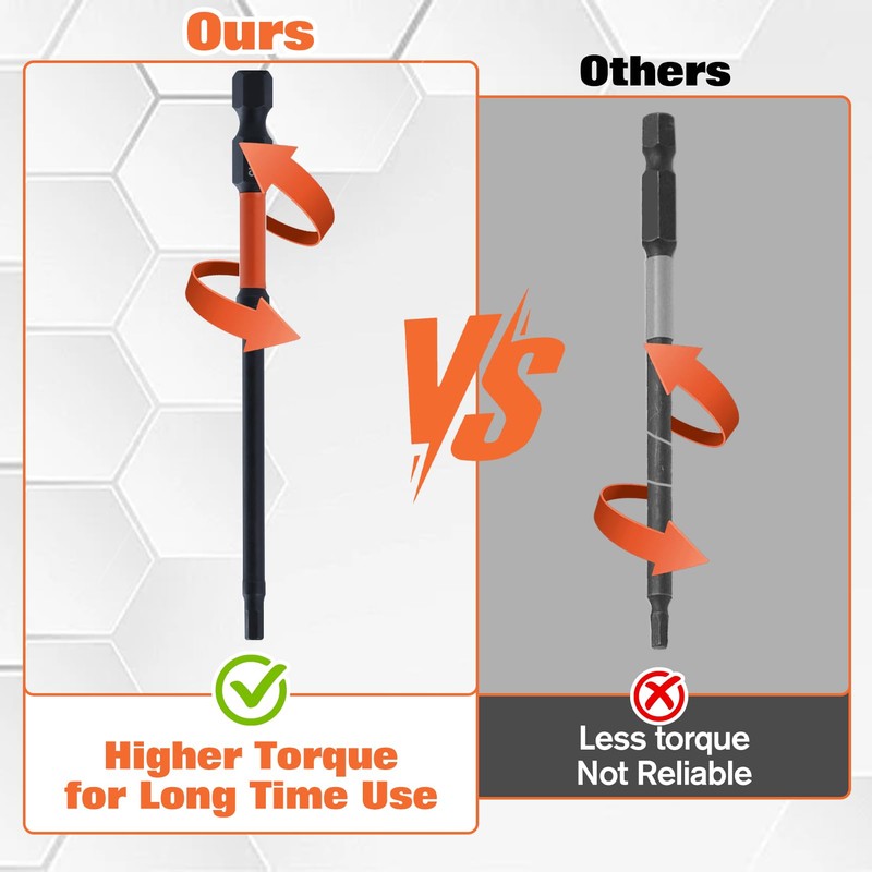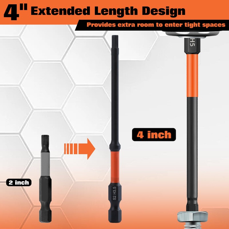 - 【MAGNETIC & EXTENDED LENGTH】Reinforced magnetic impact bits help you pick up screws with ease. The magnetism will not decay after multiple uses. The 4 inch extension is designed to be longer than commercially available drills, making it more practical and convenient. The extended length provides extra room to get into tight spaces.