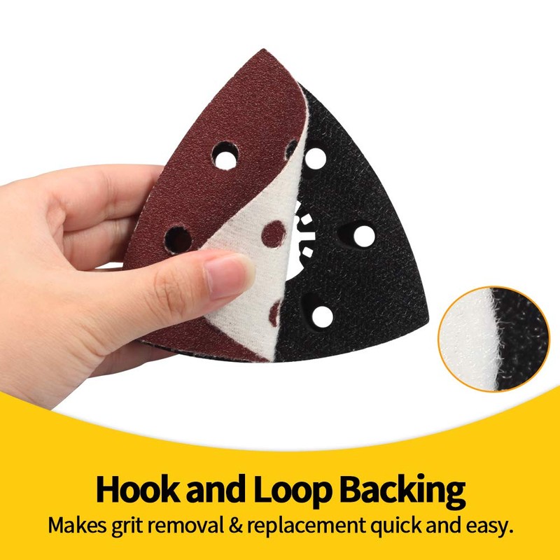 SPEEDWOX 50 Pcs Triangle Sanding Pads Hook and Loop 120 Grit Oscillating Sanding Pad 90mm 6 Holes Fit 3-1/2 Inches Oscillating Multi Tool Detail Sander Sandpaper Triangle Sanding Discs Sanding Tool