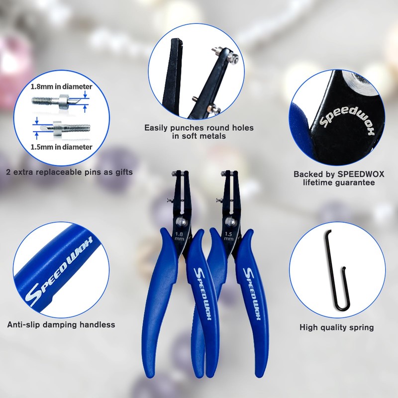 - 【2 Pcs A Set】 1.5mm Metal Hole Punch Pliers and 1.8mm Metal Hole Punch Pliers. Along with the high quality pliers comes 2 extra replacement pins as gift.