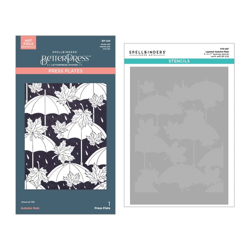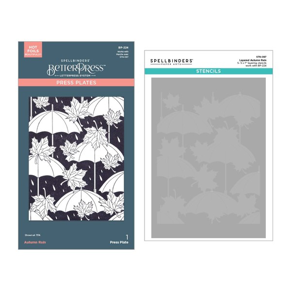 - Autumn Rain Press Plate and Stencil Bundle is part of the Falling Leaves Collection and includes BP-224 Autumn Rain Press Plate and STN-097 Layered Autumn Rain Stencil.