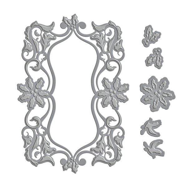 - Approximate Size(s): Frame: 5.50 x 7.90 in, Poinsettia: 1.70 x 1.70 in, Holly: 0.85 x 1.00 in, Doves: 0.85 x 1.00 in