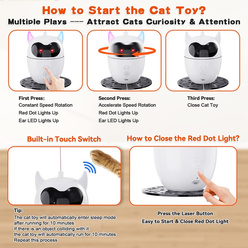 - Red dot angle adjustment: By turning the red dot angle control button on the top of the kitten toys, the red dot angle can be adjusted to meet the needs of cats of different sizes and heights. Each time the cat toy starts working, the LED light on the head will flash for about 1 minute and then turn off automatically to attract the cat's attention.